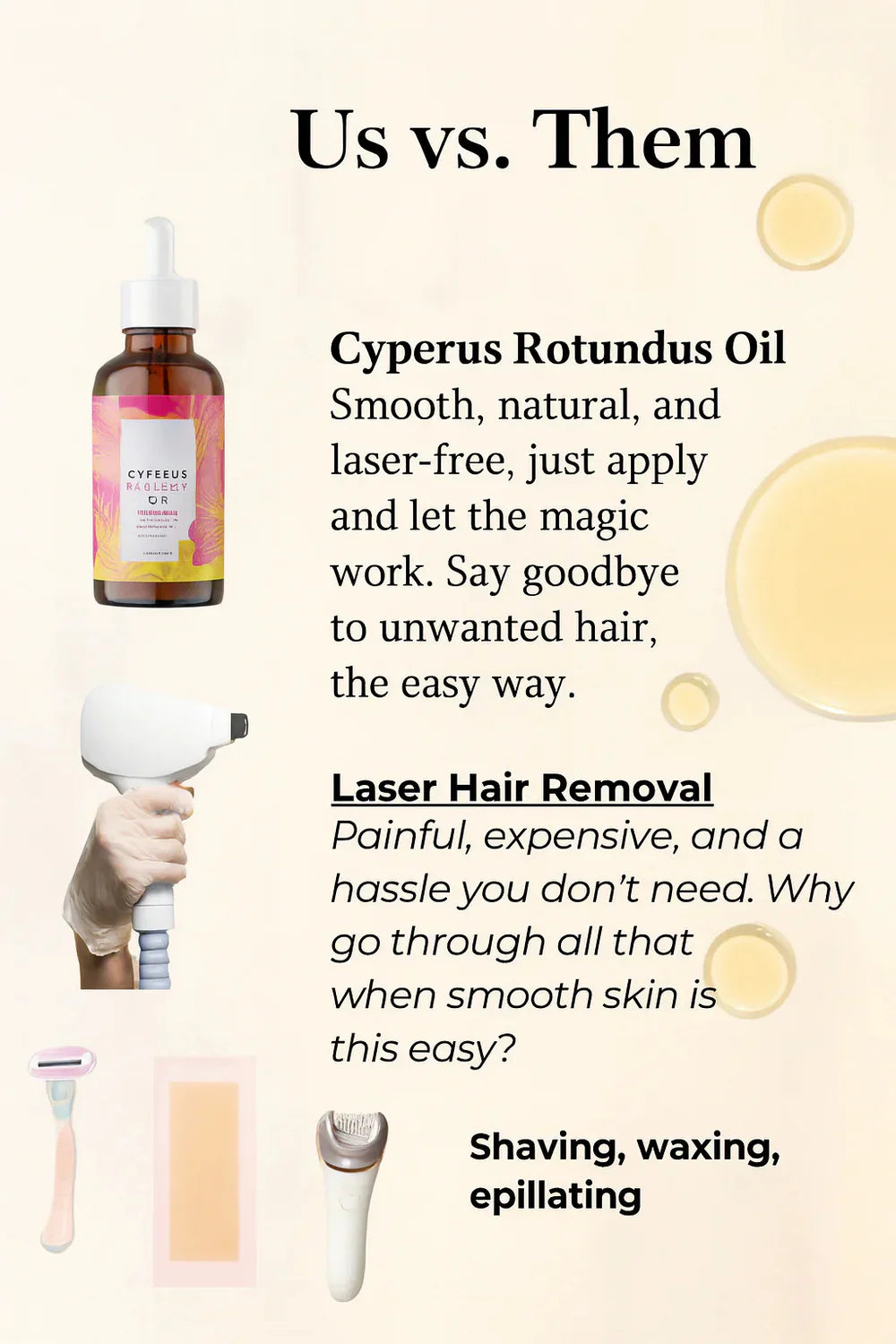 Effective Body Hair Removal: Harness the power of Cyperus Rotundus Oil, the main ingredient known for its natural ability to slow hair regrowth. This potent oil, combined with jojoba oil, rosehip oil, sweet almond oil, and tea tree oil, provides a gentle and effective alternative to traditional hair removal creams, helping you achieve smoother skin with fewer irritations. Natural Hair Inhibitor: Our Cyperus Rotundus Oil is the star ingredient in this formulation, known for its ability to inhibit hair regrowth over time. Paired with acetyl tripeptide, this natural solution offers a safer alternative to permanent hair removal creams. Tea tree oil adds an ensuring your skin remains clean and healthy. Achieve Smooth, Hair-Free Skin: Say goodbye to unwanted body hair with our Cyperus Rotundus Oil. This powerful ingredient, along with jojoba oil and rosehip oil, helps to gradually reduce hair growth, leaving you with soft, smooth skin. Tea tree oil further enhances the formula with its soothing properties, offering a natural, effective alternative to hair remover sprays and creams. Easy to Use for Effortless Hair Removal: Enjoy the simplicity of incorporating Cyperus Rotundus Oil into your daily routine. For best results, apply the oil once in the morning and once in the evening to the areas with unwanted hair. The gentle formula absorbs quickly, making it easy to use without any mess or fuss. With consistent use, you'll see gradual results, helping you achieve smoother, hair-free skin over time. Ideal for use on larger areas like legs, arms, or smaller areas like the bikini line, this oil offers a convenient, natural solution to traditional hair removal. Made with Natural Ingredients: Experience the benefits of Cyperus Rotundus Oil, the key ingredient in this formula that slows hair regrowth naturally. Along with jojoba oil, rosehip oil, sweet almond oil, acetyl tripeptide, and tea tree oil, this gentle and effective solution provides a nourishing alternative to traditional hair removal methods, leaving your skin feeling smooth and rejuvenated.