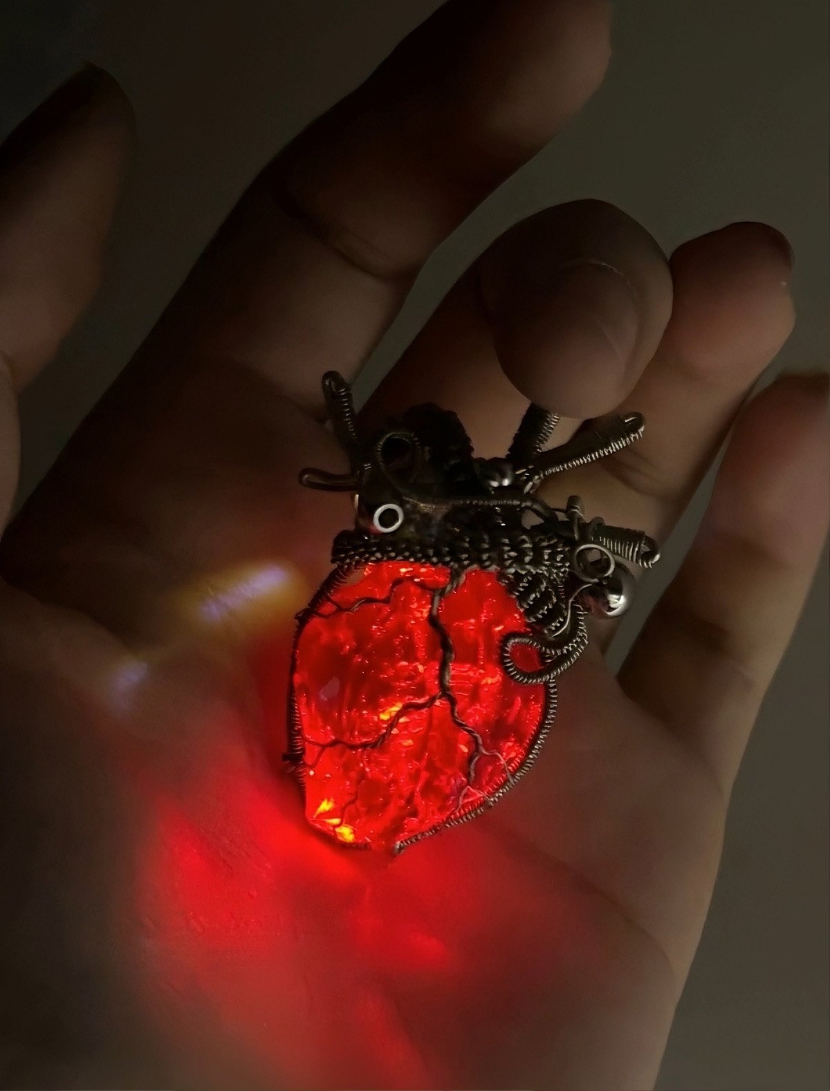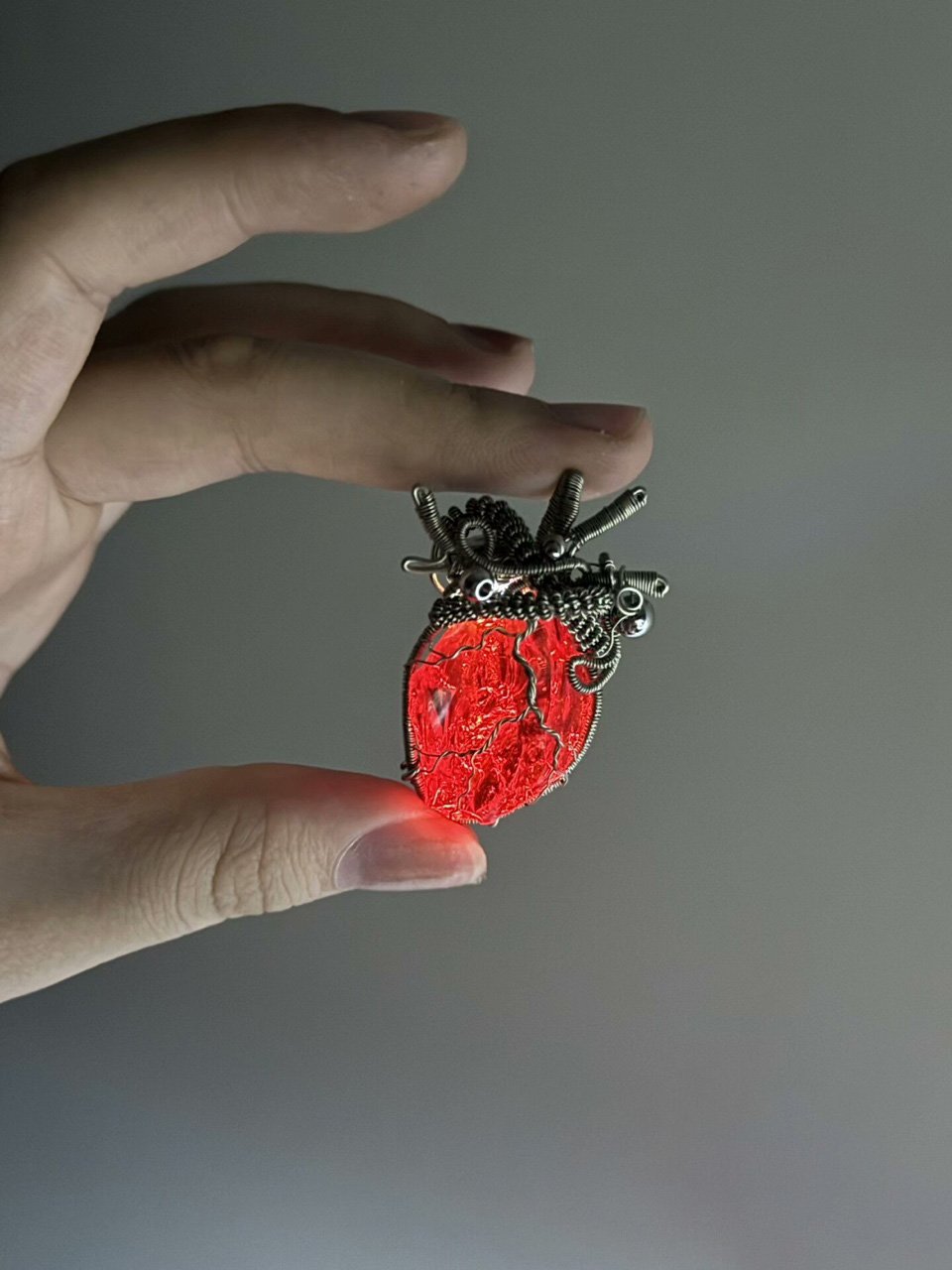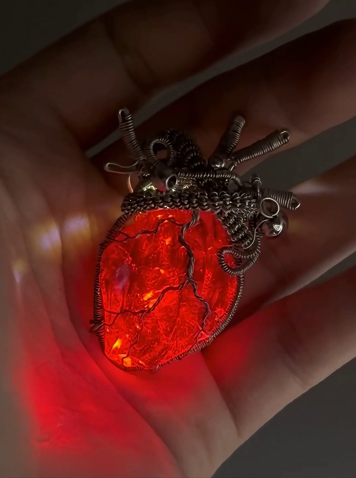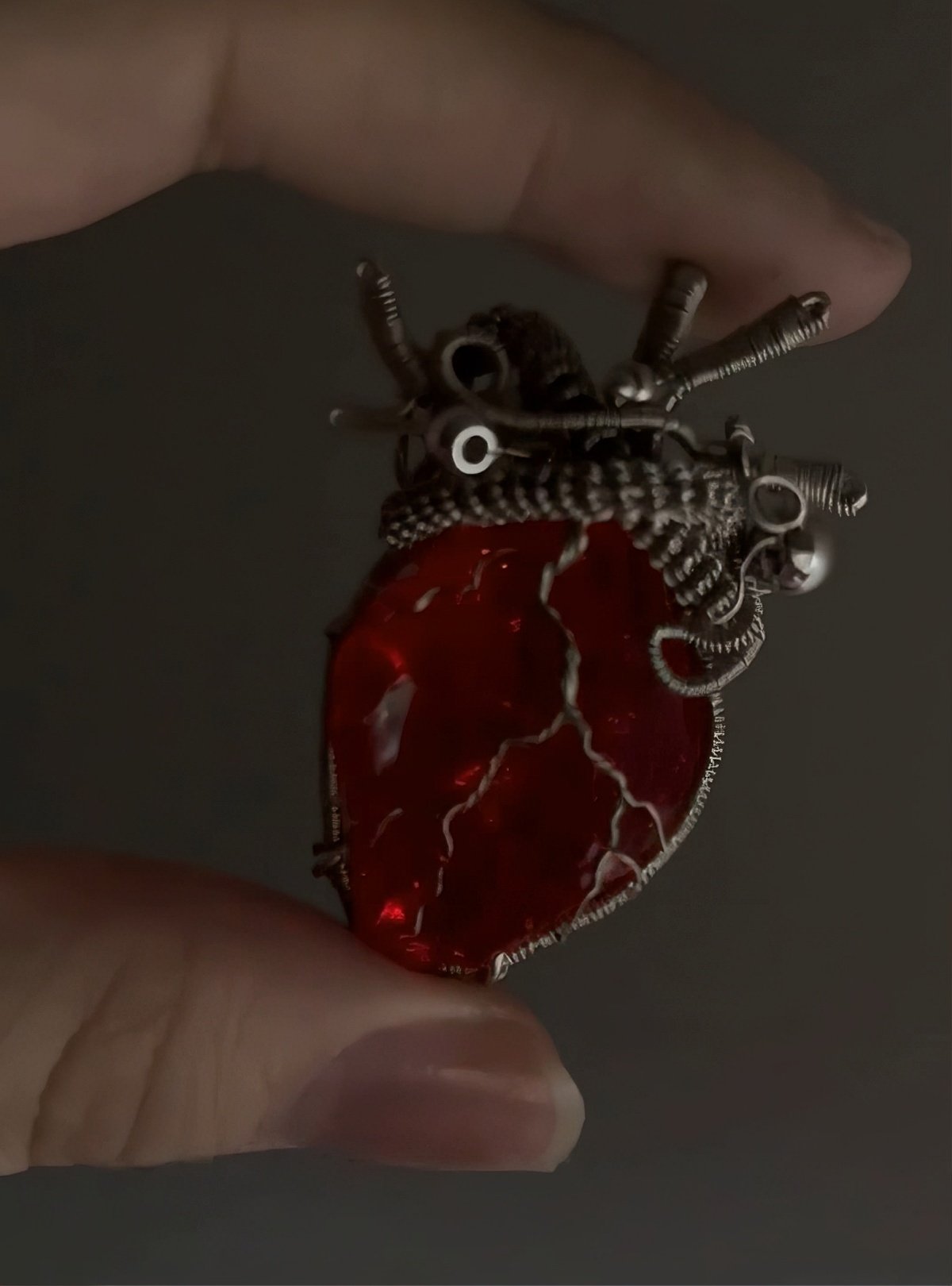 The fiery, alive heart of a flameFor the bold: a natural red crystal heart, wrapped in the same intricate sterling silver wire (vessel-like texture, sharp & striking). Its pulsing red glow mimics a living heartbeat—warm, vivid, and impossible to ignore 🔥