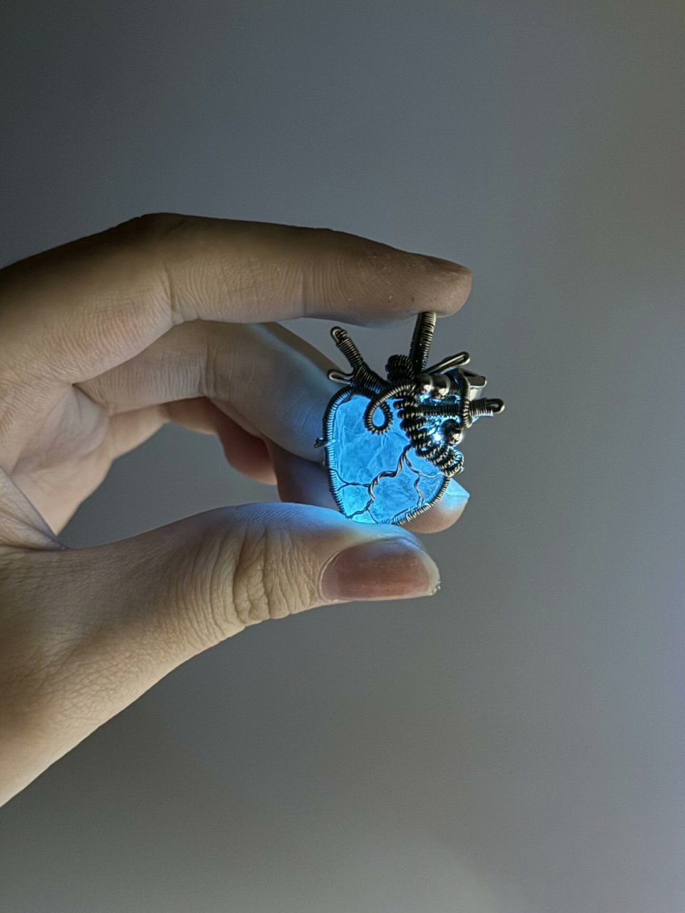 The calm, glowing heart of the deep seaThis isn’t just a necklace—it’s a piece of the ocean that fits around your neck. Carved from natural blue crystal and wrapped in sterling silver wire (shaped to mimic delicate blood vessels), it glows with a soft, breathing blue light (just like the slow rhythm of ocean tides 🌊).