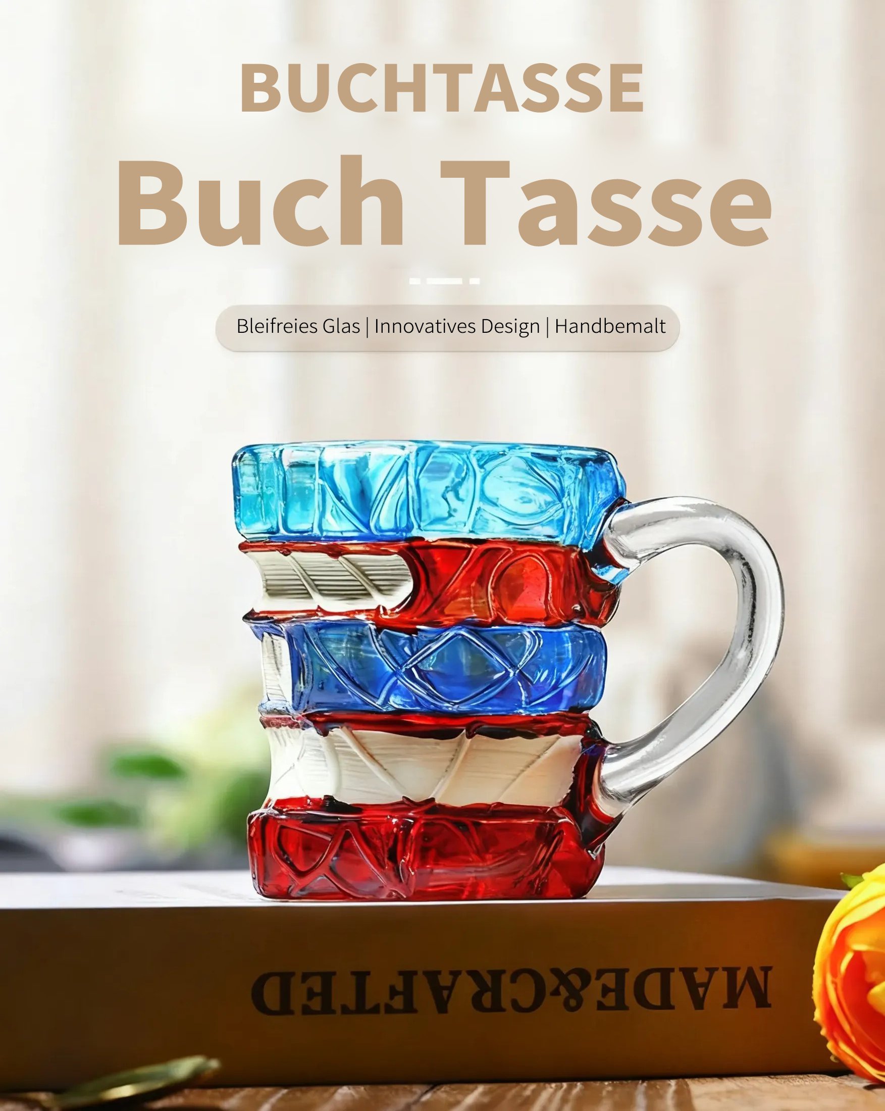 Made from high-quality, food-safe glass, the "stacked books" shine in vibrant shades of blue, warm orange, and rich red. The glossy surface and realistic book spine details lend the mug a touch of magic – especially in the light.