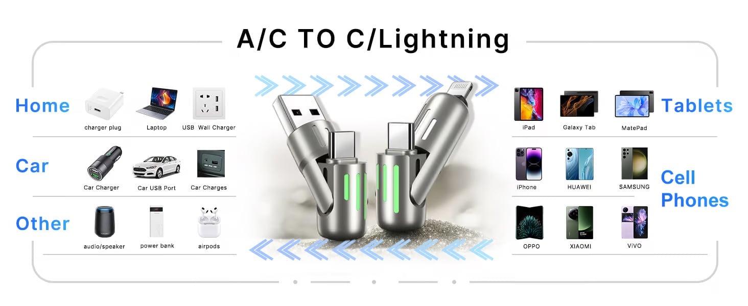 4-in-1 design:ย This usb c cable have 4 plug, USB A,Lightning, double Typc-C.